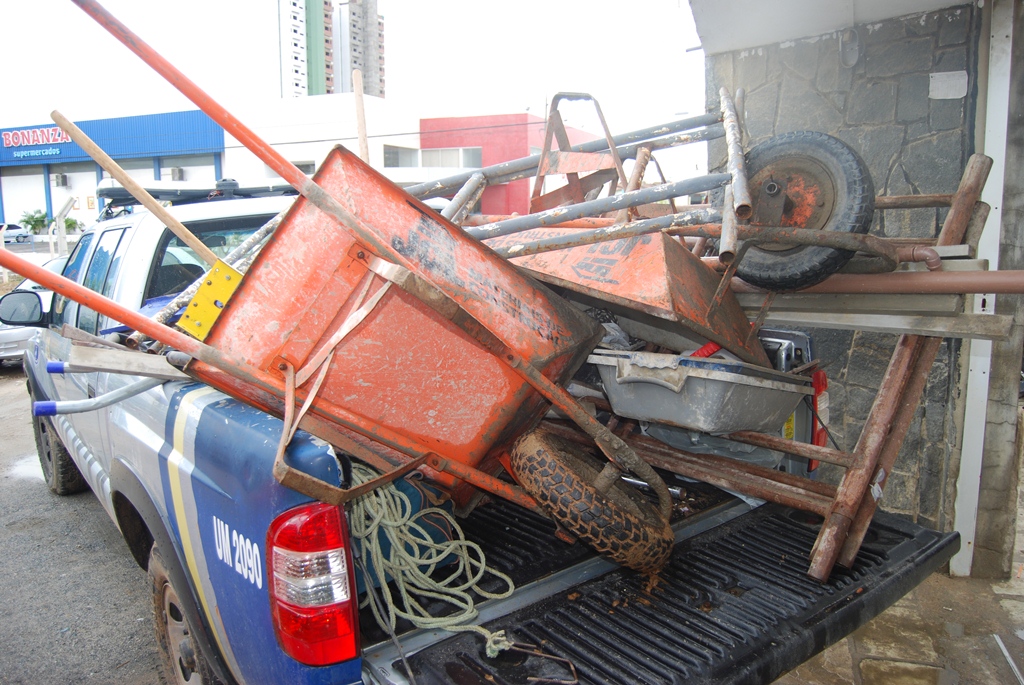 Entre os materiais apreendidos estão estrutura de andaimes, máquina de cortar piso, escada, régua de pedreiro, roupas entre outros objetos.